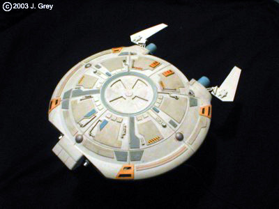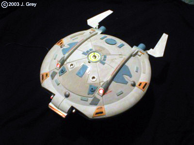 The Model In the real world hacking the Glador seemed a good idea at first but to disguise some of the detail proved harder that I thought. The warp grill at the rear is made from a series of small parts and internally lit with a maglight bulb that also lights the two upper impulse vents. The two blue things are warp field pods that stabilise the field. They're there because the beautifully-sculpted nacelles that took two weeks to form got trodden on and my patience ran out. The "subspace arrays" are there to give the ship some charisma and are designed to fold out as atmospheric stabilisers. The forward pulse phasers and bussard collectors are lit with LEDs as is the deflector and planetry sensor. The hull was decorated with styrene panels shaped to look reminiscent of the new style Starfleet hull armour and to add something to make it more interesting to look at. It was painted by hand and weathered fairly heavily for a Starfleet ship. It came out fairly well but isn't exactly what I had in mind when I started. I'm quite happy with the result though. Image: Aft dorsal Image: Engines aglow Image: Starboard bow Image: Another plan view Image: Firing phasers Image: In formation |