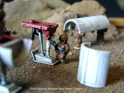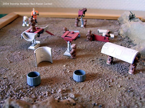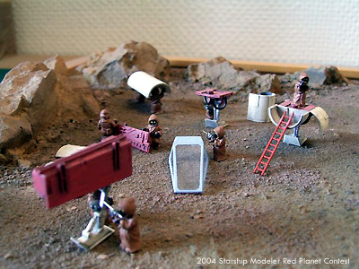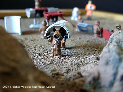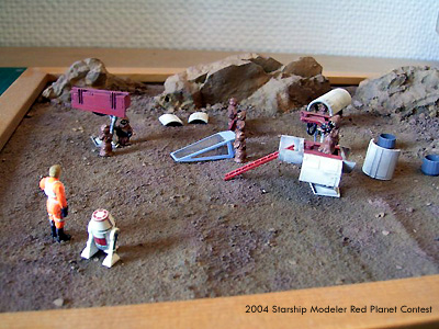The diorama is in 1/72 scale and is made of the remaining parts of my Fine Molds X-Wing kit. Some parts have been superdetailed. The small Jawas are Micro Machine figures, the size fits very well. I gave them some tools made from stiff wire, screwdrivers and things like that. The base is a wooden frame with some rocks from a model railroad. I thought the model would nicely fit into the theme of the Red Planet contest when I heard from it. I hope it will enrich the contest in terms of humor and jokes. Been there, done that!
