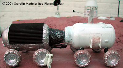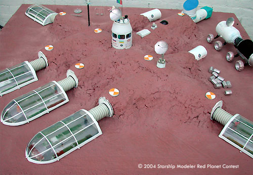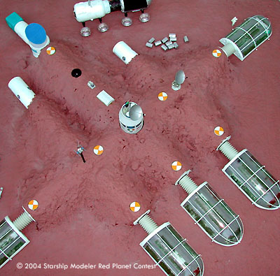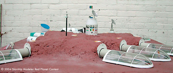 Three major ingredients in this diorama are cardboard, stem wire and junk from the spare parts box. I had the Mars surface paint mixed at Sears. The decals were printed out on an Inkjet Printer shows flags depicting the various nationalities of the colonists: Canada, Ukraine, India, Ireland, France, Britain, USA, Russia. Printouts include the names and logos of the companies involved in the design and production of the colony and its equipment and the red-green-blue Mars flag flying above the tower and the Mars Society logo since all of the colonists are active members.