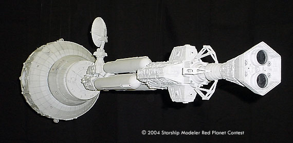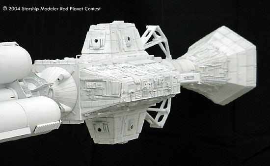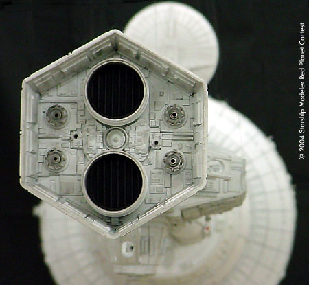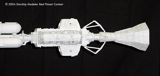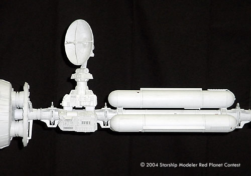 I tried to use as many kit parts from “2001” model kits as possible to kit bash for the external detail. Other model parts are from kits that have been known to be used in some other classic sci-fi effects models. The reactor and engine housing are almost entirely from parts I had made for the 11 ft Discovery with a few from the Aries 1-B thrown in. The spine, connecting collar and antenna dish are all from the Discovery as well.