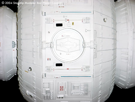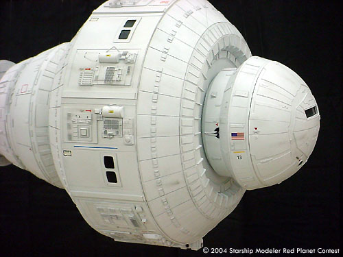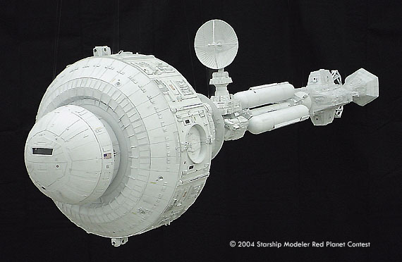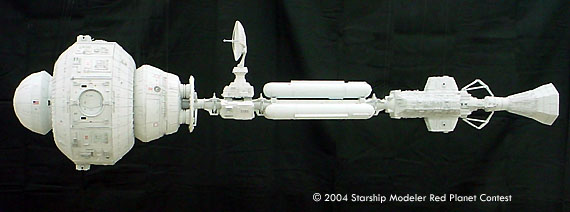 This piece is constructed from a wood/metal armature with resin and plastic detail parts added. It was painted overall flat white and weathered with pastels. I tried to keep other colors and decals to a minimum in order to stay true to the "feel" of the "2001" filming miniatures.