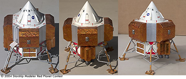 The middle and right images show the engine modules better. Since this Lander is carrying more supplies, there are three descent engines per side, the Habitat Lander has two per side. The engine frames are constructed from Lego blocks covered with Space Blanket, and J2 engines from the 1/200 Saturn V kits. The great thing about using Space Blanket is that one side is gold and the other silver. This gives you two natural finishes for the price of one. Micro Metal Foil Adhesive was used to attach the Space Blanket material to the model. I brushed a coat of Tamiya Clear Orange over the gold foil. This gives a deep gold color, similar to the Kaptan insulating material used by NASA.