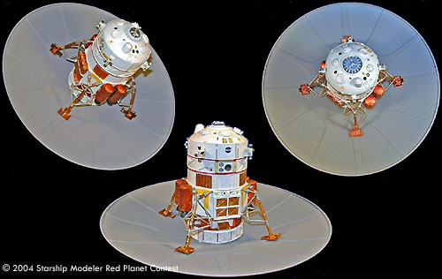 This shot shows the Transfer Ship/Orbiter without a Lander attached. In the foreground is the CSM/Command section. The octagonal section is constructed of sheet stock. The cylindrical section originated as two Pilgrim kit sections with corrugated and strip styrene for additional panel detail. The domed piece is also from the Pilgrim Observer kit. The pivoting communication dishes are from the Millennium Falcon. The sensor pods/airlocks are from assorted building blocks, the sensor domes are buttons and the rest of the details came from the spares box. I used Bare Metal foil for the aluminum panels. Space Blanket, and assorted decals provide additional detail. The silver hexagonal piece in the center of the Command Dome comes off to reveal a threaded socket that allows me to “dock” either of the Landers.