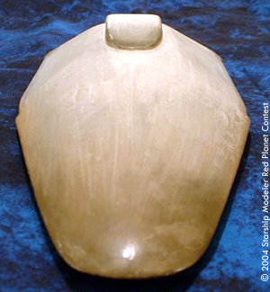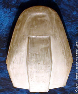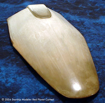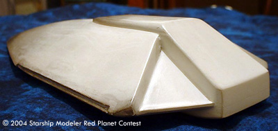 Construction began with a sheet plastic framework, which later had balsa wood (filler) added in places. This was covered with Bondo automotive filler, to get the main shape mostly correct. From there, I used various automotive putties, to smooth things out. I decided that the ship, being all white, would be a bit too boring. So I went with a "burning up on reentry" sort of look to the final finish.