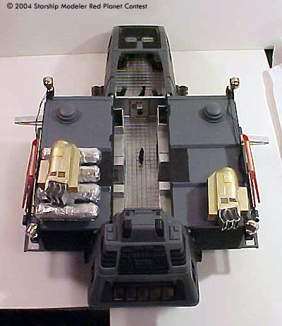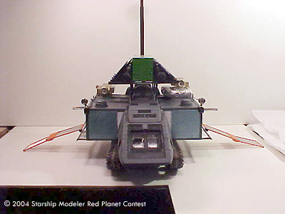 The model in 1/72 scale is a combination of kit bashing, spare parts box objects, and scratch built items. The lower hull of a 1/35 scale M1 Tank and a Star Trek Runabout Body make up the chassis of the Travois. The spare parts box donations where the radar dish, seats, air handling engines, the drivers panel and other items. Bought items include the dogs, the floodlights (which actually work as they came from marine section of the hobby store), and detailing items.