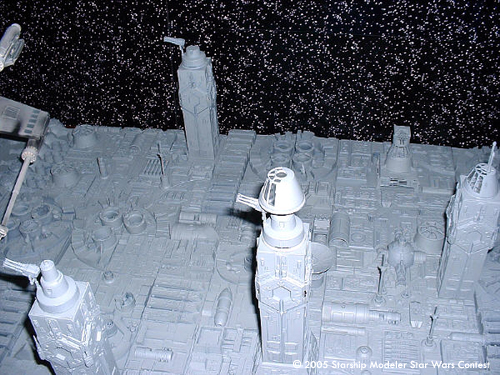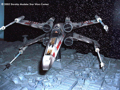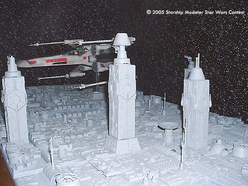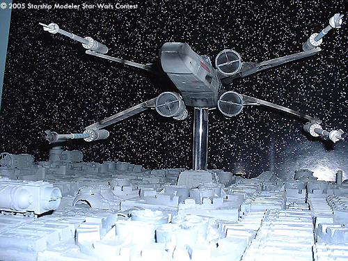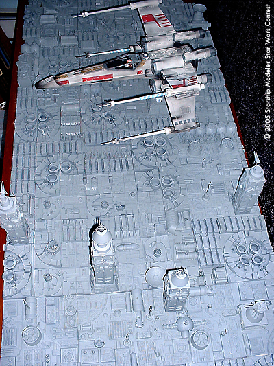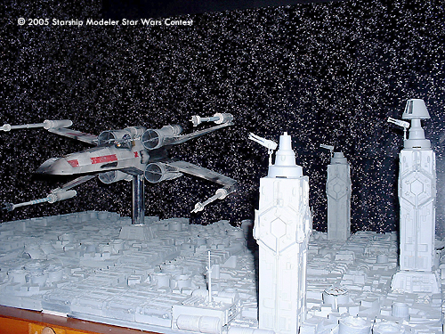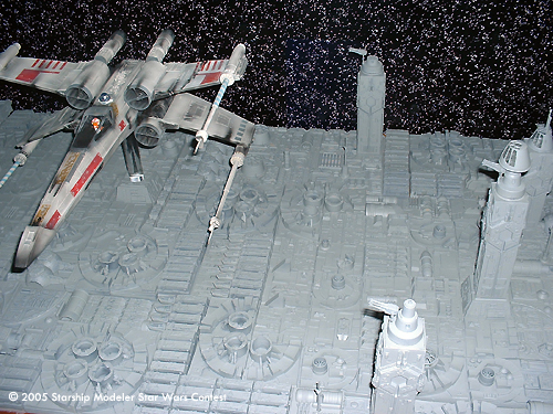 This diorama was very difficult to build. I positioned parts into place before deciding where each piece would be placed. Many parts were built up and formed into one piece and then placed on the diorama. You will notice that there are several gun turrent towers added to give the affect that the X-Wing passing by was being fired upon. The X-Wing was not constructed by me. It is a prop replica made by ICONS. When placed in the right position, it took on the look of a low flyby. It fit in nicely to complete the look I was trying to achieve.