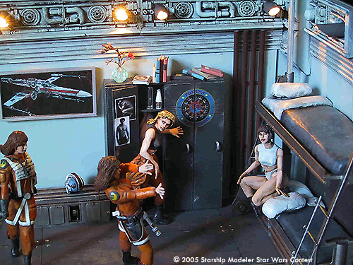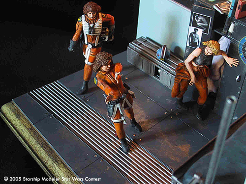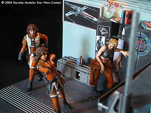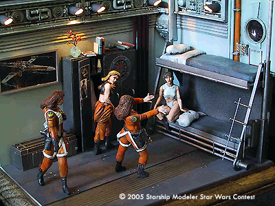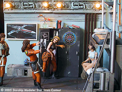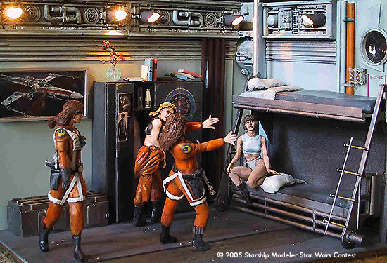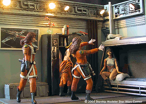 This small vignette depicts Rogue Squadron pilot and Jedi Knight Jaina Solo as she describes her latest kill in typical fighter pilot fashion. The setting is the female pilots' quarters aboard a New Republic cruiser.