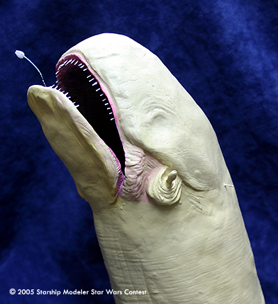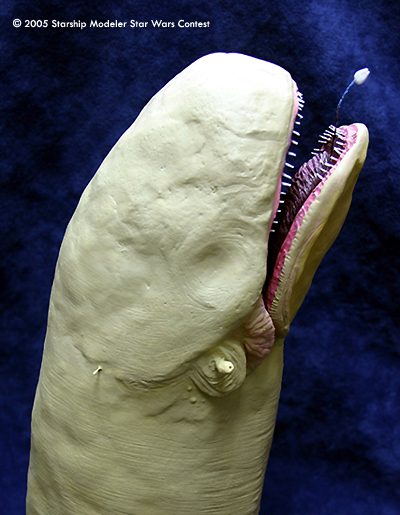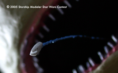 The Falcon is made from a 6mm long piece of styrene. It is not very detailed, just the basic shape and some pencil-detailing to give it a little depth. It is attached to the creatures tongue by a small brass wire painted black with blue painted accents added to create the blue light seen when Han and Chewie are accelerating.