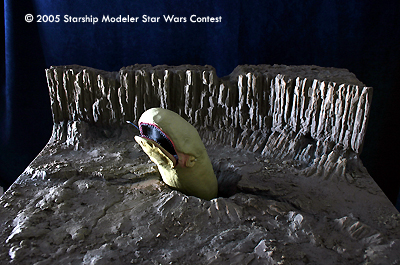 The escape from the Space Slug in the Empire Strikes Back is the subject of my diorama. It's my way to honor the rubber handpuppet that was used to such good effect in the movie. It is designed to be photographed the way it can be seen in the poorly lit picture (lit from the left side only with a daylight bulb). That way it resembles the scene from the movie somewhat.