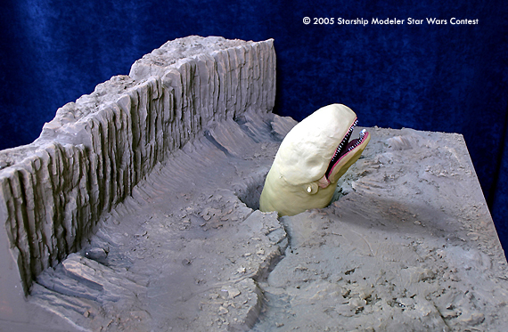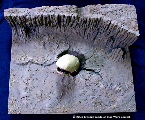 The base is a 55 x 68 cm. piece of plywood with a hole in the middle. The core of the asteroid cliff is foam. I used a foam cutter to avoid a huge mess. The core is covered with a thick layer of plaster, with all the detail chisled out. The creature is made from a foam core covered with DAS clay. Some detailing has been done while the clay was drying, some has been added afterwards. Teeth have been made from toothpicks. For reference I have used the movie of course, as well as some internet resources and the Lucasfilm archives book.