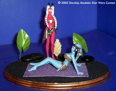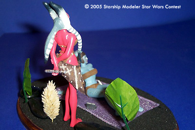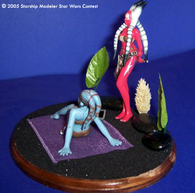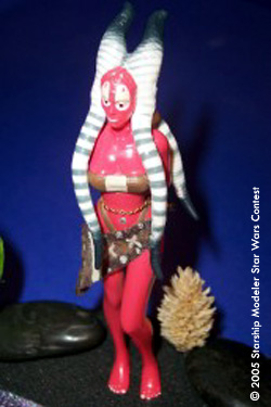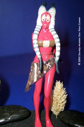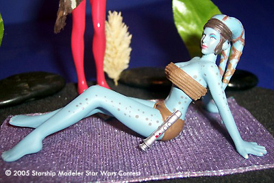 I was arranging my new Star Wars figures one night when I happened to notice they were close to the same scale as a couple of female anime figures that I done. A light bulb appeared over my head. Who else would have made the perfect subject but Shaak Ti. I bought another Shaak Ti figure and removed the head. I removed the head from the standing anime girl model I had. I matched the color of her head with laquers the best I could. It is not exact but you can hardly tell. Before I attached the head, I painted the body and then the bikini. I kept with the tradition of the Jedi and painted her bikini brown and a light tan using acrylics. I felt that the bikini alone was not enough so I took the long skirt that the action figure came with and made a waist wrap. I coated the top and bottom with thin glue so the threads will not come undone and the wrap would keep its shape. The designs were painted on. Still not quite happy, I decided to but on a waist chain and a belly button ring. I changed the ring to a crystal afterwards. For a final touch, I painted on some tattoos on her left hip and the backs of both shoulders.