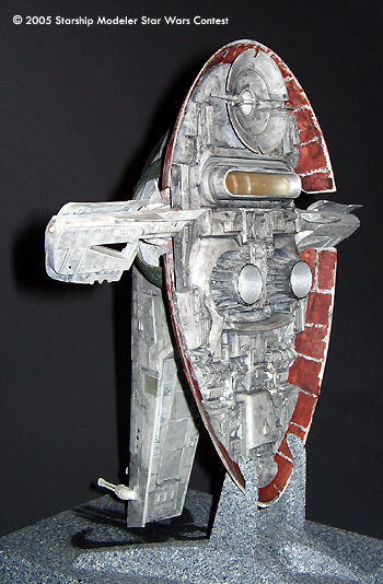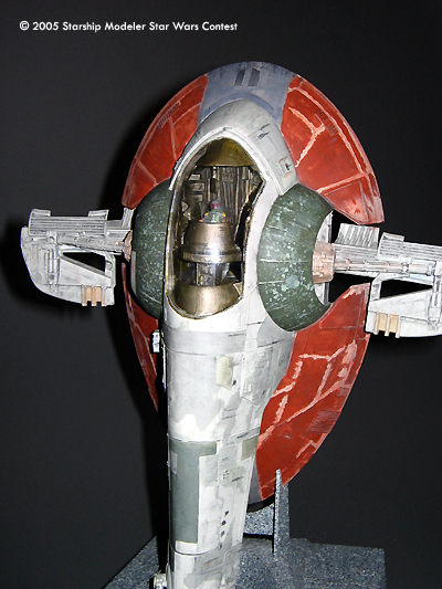 There were a few minor fit problems but nothing serious. The model features lighting from yellow LEDs and a red blinking LED connected to fiber optics for underside clearance lights. I took liberty with the main engines and used ones from an F15 Eagle in 1/48 scale. A few details were added to the cockpit area and exterior of the ship.