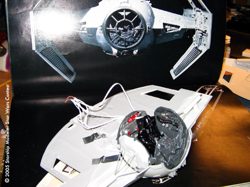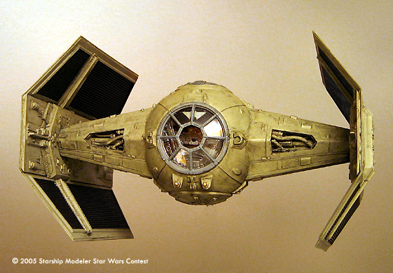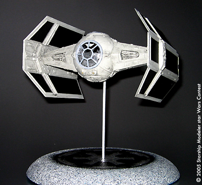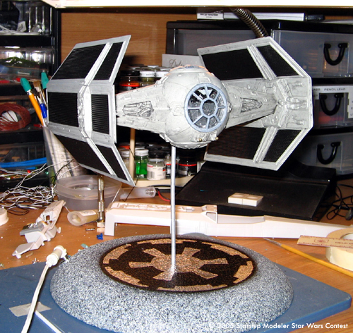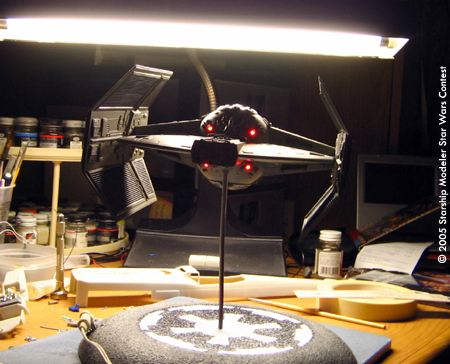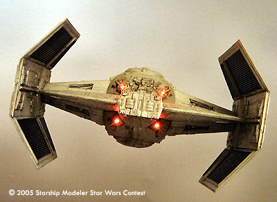 This kit is the original AMT Ertl release from 1978. My model features a detailed cockpit interior detail with fiber optic lighting, and the Darth Vader figure is backlit with a red LED. The quad engines are also lit with super bright red LEDs. These lights are all supplied by 1.5 volts of direct current. A few exterior details were added in addition to some panel lines being scribed. The base is actually a 10” dinner plate panted with Fleckstone spray and the Imperial Insignia was painted by hand. The model is approximately 1/48 scale.