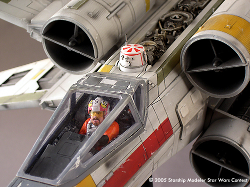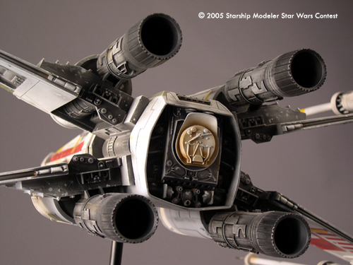 Forget it Luke: I couldn't bring myself to model yet another Red 5, so I chose to make my X-wing Porkin's ship, Red 6. Several changes were made to accomplish this. First, the Luke pilot was modified to resemble Jek Porkins. Next, the R2 unit needed to be replaced by a R5-D4 astromech Droid. This item was scratch built, cast, poured in resin and painted. Finally, six stripes were painted on each wing (to show the ships ID as red 6). There are no specific shots of red 6's ship, so the exterior panel details, fuselage stripe and weathering were created by looking at various X-wing models used. I also decided to glaze the canopy (which was not done in the original miniatures). I thought it just looked better and CG glazing was added to the re-release of episode IV anyway.