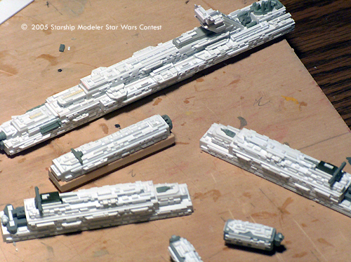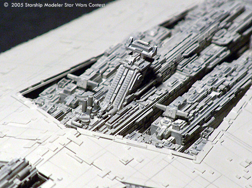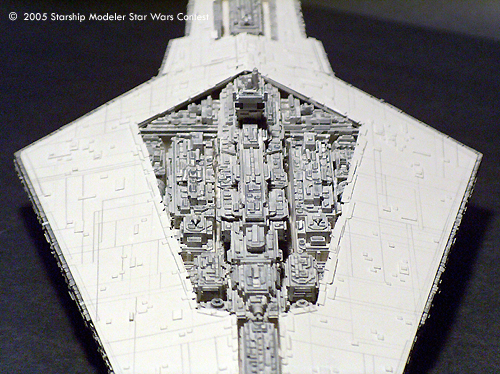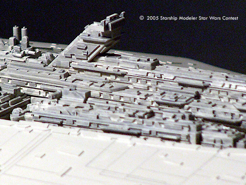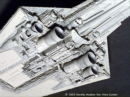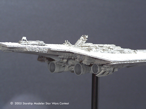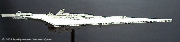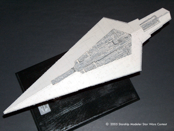 The engine bells are steel thimbles that I got at the local hobby store. I just liked the way the ridges looked like an engine! The internal parts on the engine bells are scrap parts from the Tamiya Enterprise kit. The bridge area and other assorted greeblies are from PBX phone connections, from my full-time job, augmented with small scrap plastic. ![]() The leading edge is an Evergreen styrene 282 (H-column) strip and the hull is covered with various .010 and .020 thick styrene shapes, cut first in strips and then cut into smaller pieces. All the parts were glued on by hand. Total parts' covering the hull is about 2000, give or take a few. The neatest thing about the build is that I used parts from the Naboo Starfighter for some of the engine detailing. The base is a wood plaque purchased at the local hobby store and the Imperial insignia disc is cut from some .030 thick styrene with a decal made by first scanning it from my Empire Strikes Back soundtrack. I then printed it out on some decal paper and applied it to the pre-cut disc. The date plate was done the same way. Both decals had some bubbles that wouldn't flatten out with decal set so I just left them that way. Hey, fun right? After securing the data plates to the base I coated the whole thing with gloss coat and that was that! The hull of the ship was painted with Testors Model Master Camouflage Gray spray paint with the darkening of the superstructure using Testors Model Master Gunship Gray bottle paint, thinned down and washed on the surface to bring out the details. Afterward I drybrushed the hull to bring out more detail. Additional detailing on the model was done with technical pencil and a straight edge. After all was said and done the whole thing was sprayed with a coat of Testors Dull Coat spray and then more hull lines were added after which another and final coat of Dull Coat went on. There are some screw-ups on the model because I built it so quick but I won't tell where they are! Total time from start to finish: 3 weeks, working weekends and some nights of the week after work. I think the whole build came together rather well and this is the first scratchbuilt model that I have entered into competition. Image: Starboard side Image: Right/rear view Image: Bridge, from behind Image: Upper half, center Image: Bridge, side view Image: Engines Image: Under construction Image: Lots of detail |