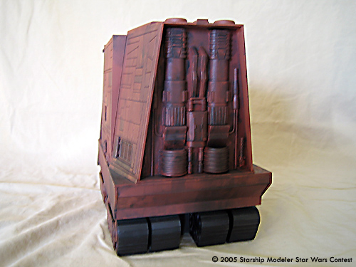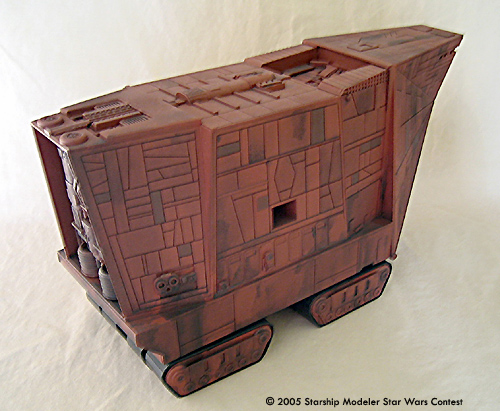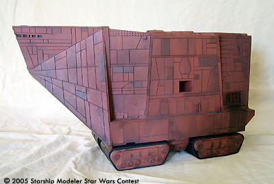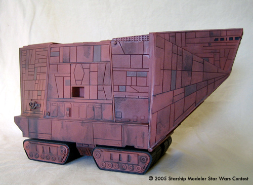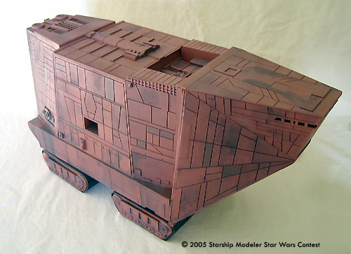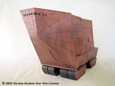 This is a scratchbuilt Jawa Sand Crawler model. It was made from styrene sheets with some kit-bashed detail. It is about 1/48 in scale; the dimensions are approxemently 14" x 8" x 5". This model was originally built for the "Other Guys" model contest that Starshipmodeler had, but unfortunately it was not finished in time to