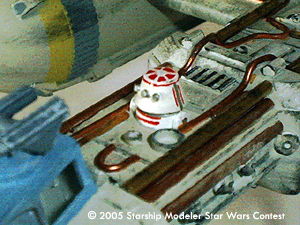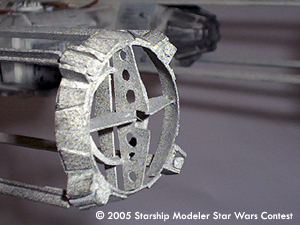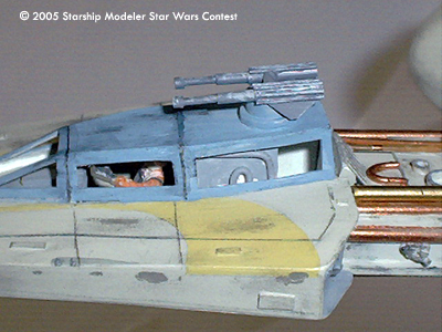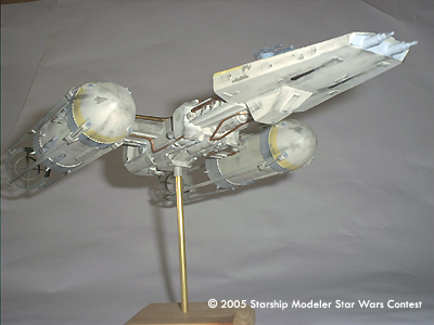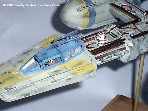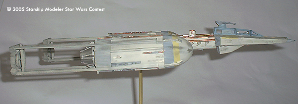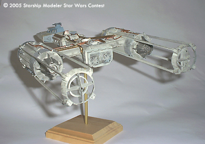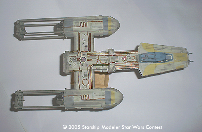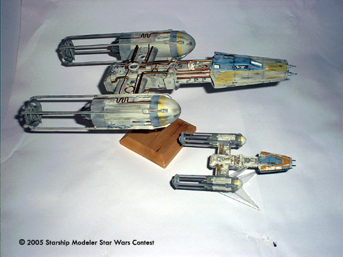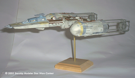 This is my scratchbuilt Y-wing. I built it from Evergreen and Plastruct components, plastic eggs, pvc pipe, bits from the spare parts box, and a pilot from a ROTJ X-wing kit. It is painted with Testors Model Masters paints. It's about 17 inches long; it's not built to a specific scale, but close to 1/48th.