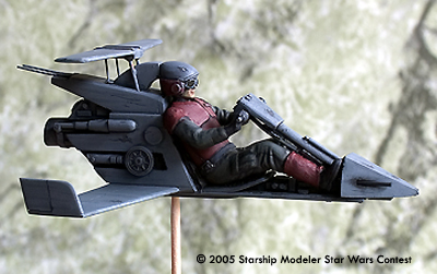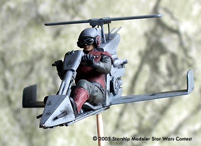 The model is mainly built from plastic card, aluminiun tubing and brass sheet. The pilot is a 1/35th dragon modern US tank driver. There are some panzer iv tank wheels in there and some zundapp motor bike forks.