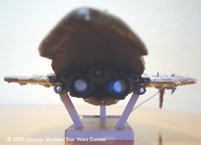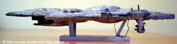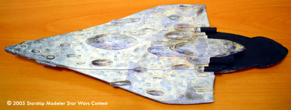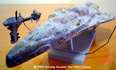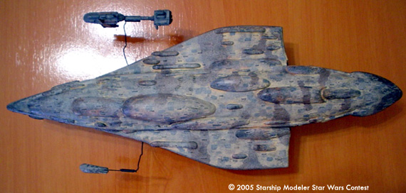 The model was built using styrene plastic as well as Milliput epoxy putty for the “bulges” of the cruiser. It was covered with little 0.10 and 0.20 thick styrene shapes. Engines were assembled using styrene tubes of various sizes.