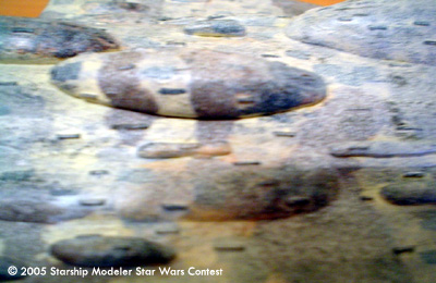 The model was painted with Model Master Light Gray. The hull was painted with various color patterns with Tamiya Flat Black, Brown, Light Gray and Sky Gray. The engines were painted black and Tamiya Clear Blue.