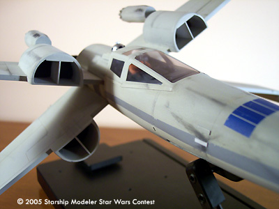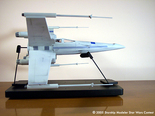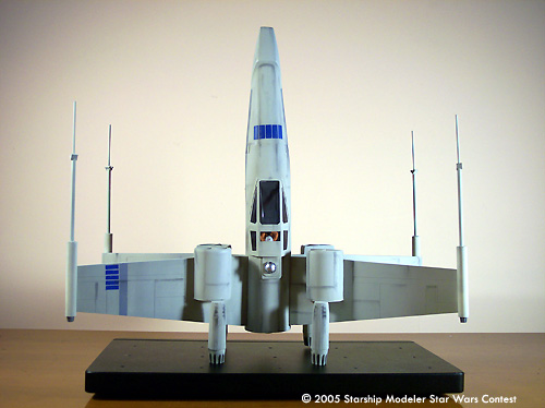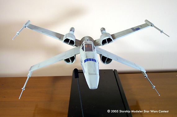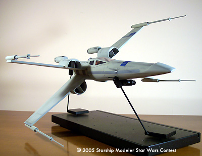 My X-wing was built from the famous Ralph McQuarrie's paintings of his fighter. I used blue squadron markings from the book.