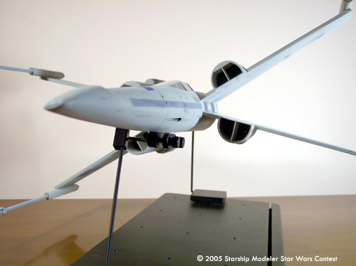 The fuselage was carved from wood then vacuum formed. The wings were sheet styrene. The engines were 1-1/4" pvc and flower holders with wire connectors as nozzels. The pilot is from the commercial kit with a full helmet and R2D2 is the early version with the radar"thingy" on its head.