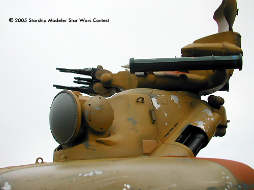 The model is based on the AMT Trade Fed Tank the main changes are as listed above. Lots of filler and plastic card to change the body shape especially around the reduced hull rear. Another Trade Fed tank provided extra guns. The two radars came from 1:16 Tamiya Gepard. The other kit parts used are from: