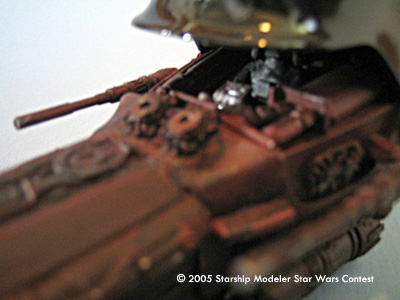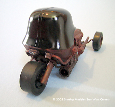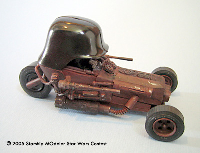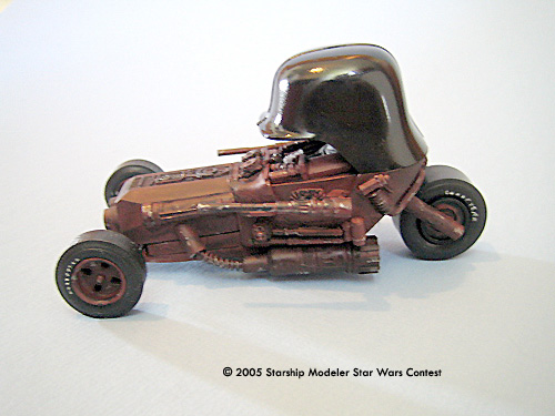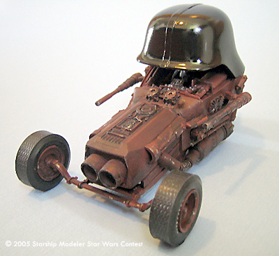 This model is an altered Red Baron by Monogram. It is 1/35 in scale. Construction began by removing one of the rear wheels, then the engine was built up by kitbashing it from spare model parts. The Darth Vader pilot was created from a Tamia tank soldier. The model was painted with rust color primer and a gloss black spray paint.