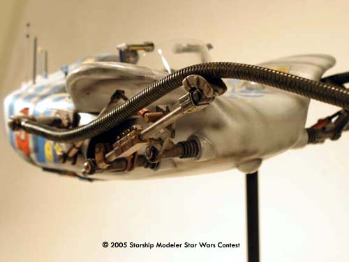 The understructures of the pods are 4" PVC pipe. The front foils were vacuum formed from styrene over a fabricated wooden form as were the turbine details front and aft on the motors. The outer surface detailing was fabricated from a combination of styrene, brass and copper tubing,strip and rod.