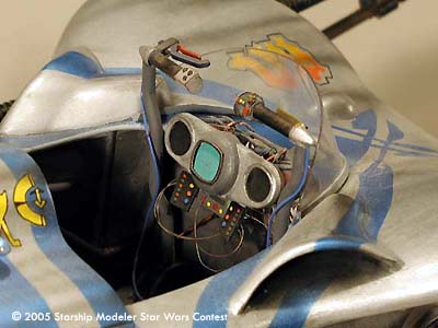 The pod was carved out of foam then covered with a combination of smooth-cast polyurethane resin and cavocil(to make the resin thick enough to brush on) then sanded smooth.Details were added using vacuum formed pieces. The cockpit details were fabricated using brass and styrene strip and rod. The suspension was fabricated from brass and aluminum rod with ABS and styrene fittings.