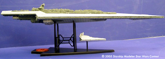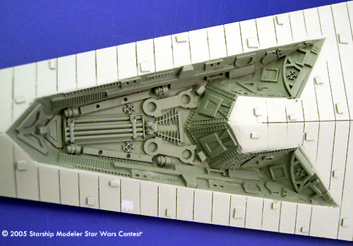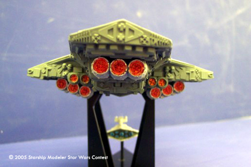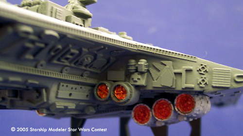 I molded the engines from the Republic Assault Ship toy to make the engines for the SSD. It had good detail and was the right size. I painted the inside of the engines white then added transparent orange and red paint.