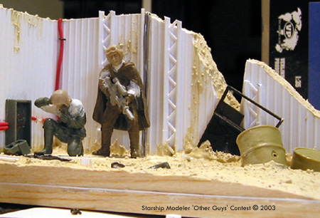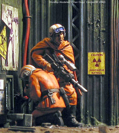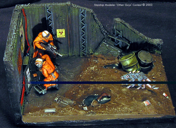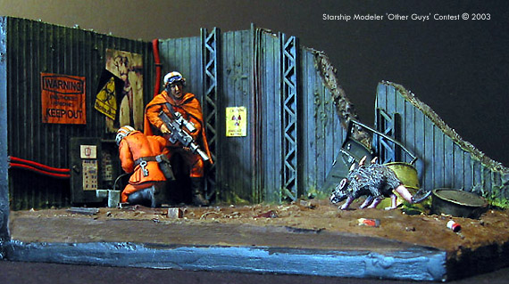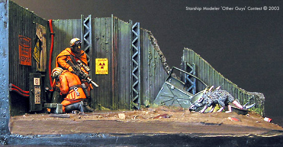 Scale: 1/35 Statistically the second most dangerous job in New San Francisco is that of "Cable Guy". Cable repair technicians work many levels below ground, descending down in the bowels of the original city in a constant struggle to maintain the network of cables that supply information, heat and light to the city. As well as unstable structures and large quantities of toxic waste, they have to cope with the mutant creatures that live in the darkness. So next time you turn on your TV, think of the "Cable Guys" The "Cable Guys" are Tamiya plastic troops. The guy on the phone is from a German observation group and the other with the gun is from a set of Russian tank riders. They both have reposed arms and new heads from Verlinden. The rifle is a Gameswork shop item as it the mutant rat. I am particularly proud of the Cambells soup can.
