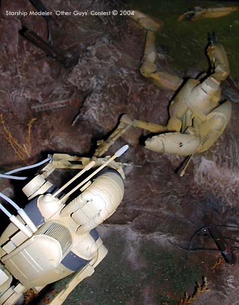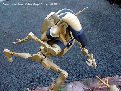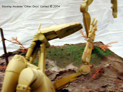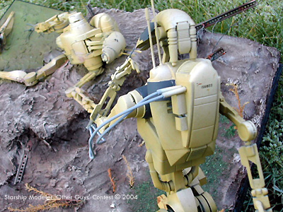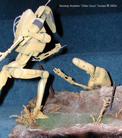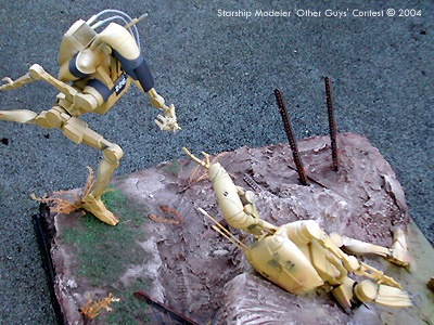 I wanted to create a diorama that conveyed the same feeling as that of a GI shouting for the courageous Medic who runs over through enemy fire to aid his comrade. This idea had been floating around with me for a while using the AMT Droid kits. Commitment came when I decided to destroy a WWII diorama to give me a base big enough for the idea and finally glued the two droids together to get an idea of layout. The models are both from the “Trade federation Droid with STAP” kit from AMT. The variation to the Med-canic is as listed above, the armoured back pack a segment sawn from the top of the STAP, with an truck engine grill added and filed to shape. Various plastic tubing was used for the welding probe. The joints of the Droid were changed and filled to give the running stance. The injured comrade is built up as normal with changes to the hands and the right lower leg left off, part used and exposed in the mud with wire and odd bits used to add detail to the broken limb. Much time was taken with the pose to try and convey feelings of pain. I used subtle weathering and oil stains and water runs to give some characteristic to the face of the Droid. Most time was spent on removing joins as overall the fit was poor but the size made it fun to work on. The base is expanded foam covered in plaster wall filler. Painting was done with brush and airbrush; masking was a real pain and something I wish I could do better. I should have painted it as sub-assemblies. Enamels and oils were used for the droids with acrylics for the base. Dressing on the base was Railway Scenics and rails from the spares box laced with picture wire. A coat of PVA gave a wet finish to the low green mud in the shell hole. Image: The hero Image: Looking over the medic's shoulder Image: From the right Image: Wounded droid |
