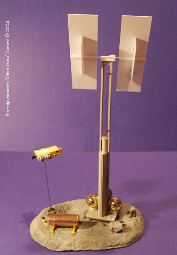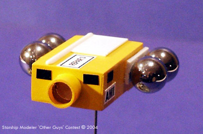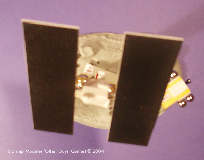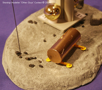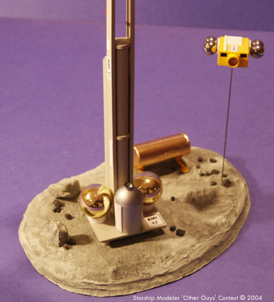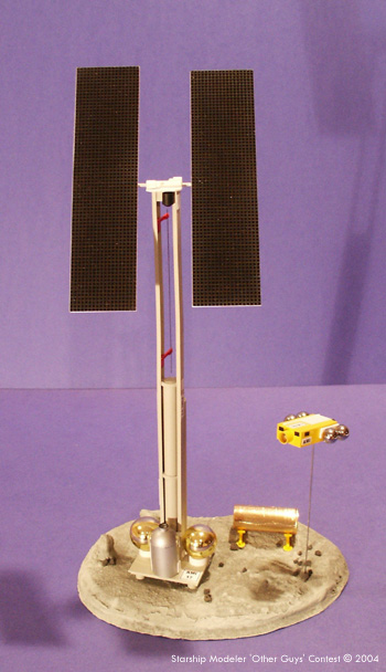 The tank farm is a ¾ inch diameter aquarium tube, covered in gold foil. The legs are styrene strip with feet of 10 mm plastic discs. The repair shuttle was made of two ¼ inch basswood strips, glued together and plated with 0.02 inch styrene sheet. The four fuel tanks are 10.5 mm ball bearings from the scrap bin at work. The large thruster is the end of a Bic mechanical pencil. Radiators and antennas are styrene, with viewing ports of black plastic tape. Paper decals were made in MS Word, and printed on an inkjet printer. The model stands 345 mm tall, and based on the size of the crewed repair shuttle is 1/250 scale. The 6x8 inch base is Durham's Water Putty over carved Styrofoam. The entire model was painted with enamels, both from bottles and spray cans. Total time to build AM17 and her asteroid home was eighteen hours. Image: Front view Image: Left side Image: Fly-by Image: Product farm Image: Rear view Image: Shuttle Image: Top view |