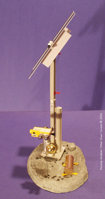 by Rob Schorry Scale: 1/250With the discovery of ice deposits in some Near Earth Asteroids in 2049, Asteroid Mining International was formed to harvest this off-Earth resource to support near-Earth and cis-Lunar development. The early AMI drill rigs were used to test harvesting methods for sub-asteroid ice. After emplacement by reusable boosters, the rigs set about drilling into subsurface pockets of ice, injecting steam, and then filtering the effluent for H2O. Dominated by their 65 meter tall gantries and massive solar panels, their automatic pipe handing equipment could drill up to 1.5 kilometers through solid rock to tap the valuable deposits of “liquid gold.” Asteroid Miner 17 was the most successful of these early robotic drill and mining ships, mining some 1500 tons of water from asteroid ES2032A. Normally operating autonomously, these first rigs were occasionally serviced by human crews when their own robots faced a problem they could not repair. Here, a crewed repair shuttle is shown making a low flyby of “Old 17”, prior to docking. The Model Asteroid Miner 17 was scratch built from styrene tubes, sheet, strips, and channels. The large gold plated processing vessels are 25 mm gold Christmas tree ornaments. Epoxy was used to make domes on the drill stand and pipe magazine ends. The solar panels are styrene 1/8 inch tile sheet, with rear mounted thermal radiators of Plastruct corrugated sheet. A brass rod allows the solar panels to swivel. A straight pin allows the panel assembly to rotate on top of the drill gantry. The gantry was built up of 5/16 inch styrene channels, and detailed with bits of styrene. The man tended habitat/operations center is a ¾ inch diameter tube with Plastruct dome end. It carries radiators and hatches of styrene. |