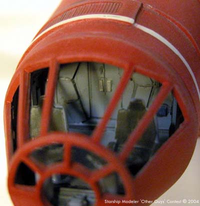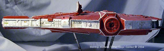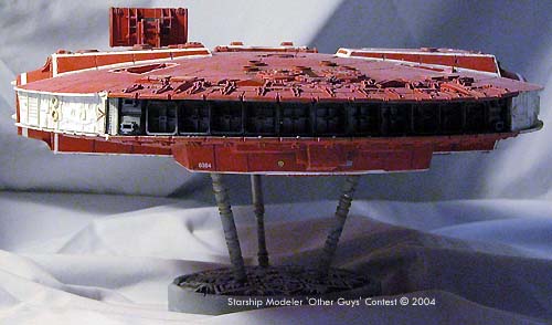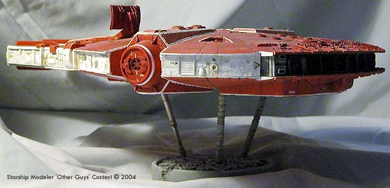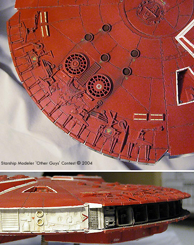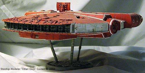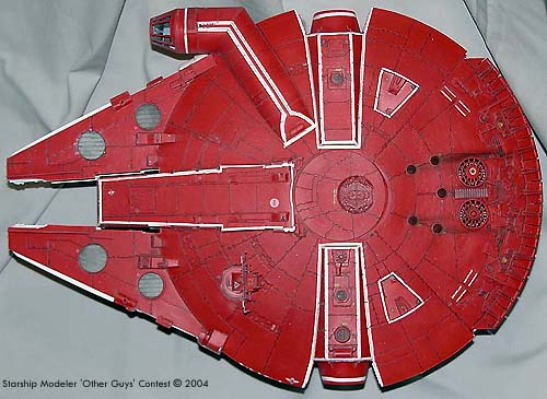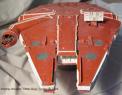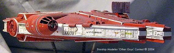 I decided the YT-1300 was standardly a 2 person craft, so I built up a new cockpit. Moving the rear wall forward some 3/8ths of an inch to make the cockpit smaller and removing the extra chairs. Of course the original model cockpit was not only lacking in detail but was just plain wrong. So I fixed the chairs, mounted them on rails and built a new set of consoles. The rear wall was rebuilt with more detail and a better door, while the cockpit walls were altered & built up . I used my lathe to remove the escape pod hatches from the sides & remounted them on the lowered laser mounts. Made new docking/cargo hatches for the side pods. Some of the hardest part of this was trying to come up with a reason for everything, or even what some things were. I decided that the front loading arms were for a cargo loading system of some sort, perhaps using presser fields to lift and load the cargo, so I just removed a bit of the detail on the top & bottom parts. The two blobs on the outside of the arms looked like a form of sensor pod so I simply smoothed them out to give them more of a pod look. Not wanting to invest the cash into a new set of landing gear pods, I decided that there were several variants of the YT, including a version with additional landing gear. So I took the two equipment holes in the bottom and made them atmospheric intakes of some sort. I decided to do this gear up, just to avoid the massive job of fixing & detailing the landing gear. With everything else I had to do, I wasn't sure of my ability to make the landing gear look good. I did though, fill in the massive gaps around the gear bay doors. The red paint job came about due to the large amount of random red panels on the Millennium Falcon, and preferring not to have a white or gray ship. I shaded all the panel edges, gloss coated it and then gave it a good wash. The decals came from several kits, from sci-fi to aircraft to armor, some 195 decals. I used white pastel chalk for highlighting the edges & wear weathering, then used grey, brown, & black pastels for grease stains and soot stains.