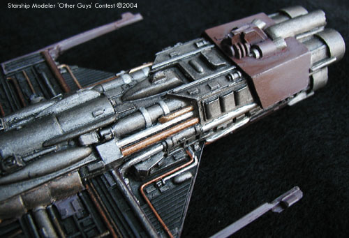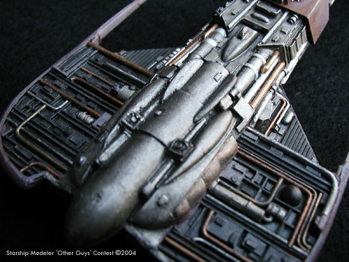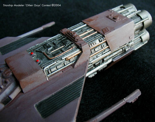 Scale: Not stated This is WARP Models’ Deep Space Freighter, sometimes referred to as the Merchantman or something like that. This is the ship seen early in Star Trek III. Klingon Valkris commissioned the freighter for a small job to make contact with Commander Kruge to deliver stolen information concerning the project Genesis. After discovering that Valkris had seen the information herself, Kruge promptly destroyed the ship after brief goodbyes. The kit comes in 3 pieces and the hardest part is getting the pot metal antenna thing on each wing to adhere to the resin. Once those are in place and then breaking them off several times trying to hide the seams, assembly is done. Engines were drilled out just to make them deeper. Some heat stretched sprue was used to detail near the aft area where the kit lacked, or just had to be cleaned out because of mold damage always prevalent with a resin kit. Painting is a purple-gray-green cocktail for the base color, with black and all the metallics I had at my disposal for detailing. A mauve wash, a black wash in some parts, red lights and some brown dry brushing finish off the painting. |