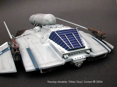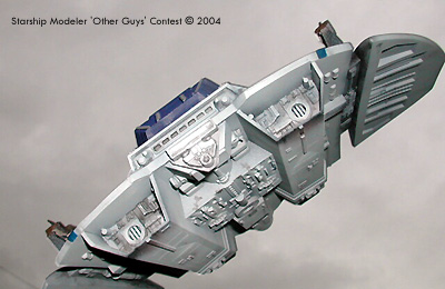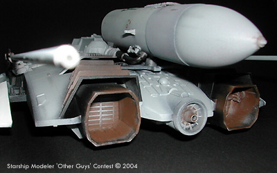I had to decide what method of re-fuelling to follow. (US style with boom into recess or European of probe on craft into basket deployed from rear of tanker) Looking at the Raider I noticed a circular port on the chin under the front lip of the cockpit. I decided this would be the fuelling port and that the US method would be used. Booms from Tie Fighter legs cut and reworked allowed two craft to fill up at once. Holes drilled into the former Laser mounts were reamed out for vinyl bushes to hold the jibs so the booms could swing outwards. Greeblies were used to make cradles along the wing for the booms and styrene tube dressed up for the booms themselves. Additional dressing up or filling was used for the holes in the hull. The engines were terrible so I binned the parts and added bulkheads with grills and a number of exhaust tubes deeper into the nozzles. Image: front/right view Image: Overhead pass Image: Rear view Image: With boom deployed |