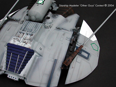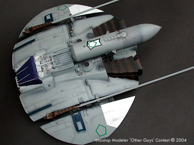 by Dec Sibley Scale: 1/60The Cylon Base Ships allow long-term support for Cylon raider operations, however during certain detached reconnaissance or long-range raids the size of the Base Ships can be a dis-advantage. A number of conventional Cylon Raiders have been converted to provide buddy to buddy re-fuelling. The “Cylon K15 Extender” flight performance is the same with just a reduction in top speed due to weight and decreased aerodynamics from the piggyback fuel tank. Wing mounted lasers have been deleted replaced by jibs that swing outboard of the wing area for the extendable booms to locate onto the chin fuelling point of the Raider. Wing markings help the inbound craft requiring fuel to align on the port or starboard side. The model is built from the Monogram kit that I have had around for years after winning it in a raffle. It was simple to build with only the Engines being a big disappointment. The idea was also simple and I wanted to make its function very obvious. The fuel tank is a small scale Columbia Shuttle tank with details and boosters removed and small details added such as hatches and mounts for the pipes. |