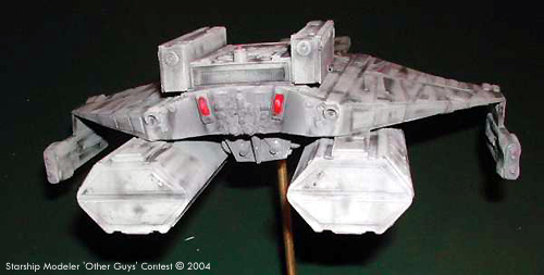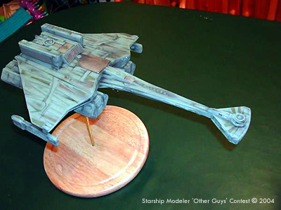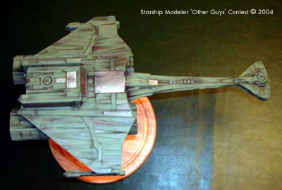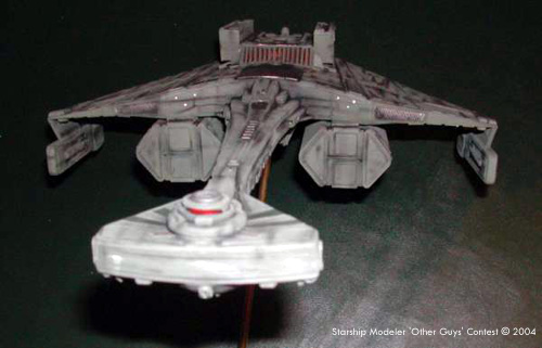 The main materials used throughout were sheet styrene a 10mm square plastic duct for the spin and a few bits and pieces from the spares box, mainly tank pieces. I began by building the command pod on the end of the 10mm ducting. I kept the shape similar to the K't'inga but I wanted this to be a smaller ship so I increased the relative size of the bridge unit and, since this was a transport, reduced the weapon pod beneath. This was all built from styrene, the pod beneath as a plastic spoon from a cafe, the bridge section was a 1/35th scale tank turret topped off with two tank wheel parts. I made the main hull from sheet styrene ribs over which i laminated sheets of styrene to get the soft curves. Layers of styrene 'feathers' were added to make a nice movie-era look. I then built up the neck, again all sheet styrene with a few tank bits for extra detailing. Again I wanted the look and feel of the movie era ships. The next step was to scratchbuild two Klingon warp drive units. I built up layers of styrene sheet and then sanded and filled to get the proper shapes. The 'twiddley bits' were supplied by various 1/72nd scale tank kits. More tank parts supplied the rear details and the top of the shuttle bay and reactor housings. By this point I had a real quandary. On paper the ship looked fairly utilitarian, but here, in 3D she suddenly started to look really mean! I nearly abandoned the concept of this being a transport in favour of it being an escort/destroyer. The more detail I added, the meaner she looked. In the end though I tested the look with the pods in place and thought se would still look like a working gal. I decided to add to the back story about this being an adaptation of an older destroyer hull. I finished construction by building the nacelle supports and gluing the nacelles in place. She was now ready for filling, sanding and touching up. The ship only needed a little filling here and there. I did make a few cosmetic changes along the ay and added a few more 'feathers' than I originally intended. I primed the ship in light grey, did a bit more filling and sanding, did a second dust of primer and deemed her fit for painting. I then painted her using standard Klingon mix of German tank grey, olive drab, a touch of white, a touch of yellow and a touch of bright green and a dash of silver. This went on easily. I then did various panels and feathers in varied shades of Klingon mix with touches of red, green, grey, black, silver and white. I painted in the impulse drive, bridge lights ad a few portholes lit. Then I got out my trusty artists dry pastels and set to some heavy weathering. This is a ship that frequently enters atmospheres that are dirty, dusty an damp so the ship got a thorough going over with black, brown, tan and grey pastels. The ship fairly leaped to life. I mounted her on a brass rod onto a round pine base. et voila!Image: Bow Image: Stern Image: Starboard side Image: Top view |