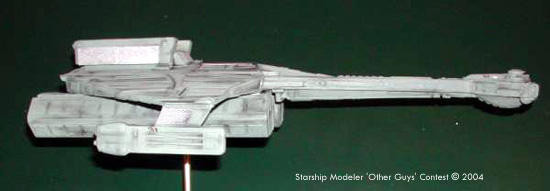by Paul Mather Scale: 1/300 (43cm/17" long)The Valkinor is a 'Strongback' class transport, a design adapted from a Valkrys class destroyer frame. The 'Strongback' class is a highly versatile transport and has been used in a variety of roles, Military transport, colony support and resource transportation. The Valkinor was commissioned in 2271 and was assigned to Support command. Its primary role has been that of a mineral transport and has been in service doing runs from the various Klingon kraylon crystal mines and later, the dilithium mines of Praxis and Rure Penthe. The Model This model was designed and built specifically for this contest. I began with some basic plans drawn on A3 graph paper, this gave me the overall general shapes I wanted to achieve. I had bought some interesting shaped pencil cases at the local stationary super store and two of these became the basis for the cargo containers. I envisaged that these pods could be ejected in case of serious problems. I wanted the ship to look sufficiently Klingon, so I opted for the classic, bridge, boom and body ensemble. |