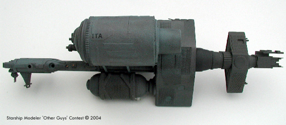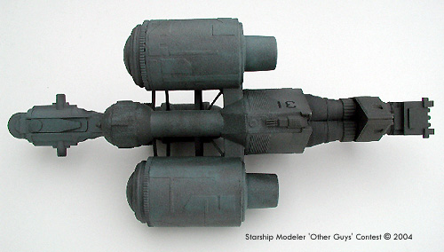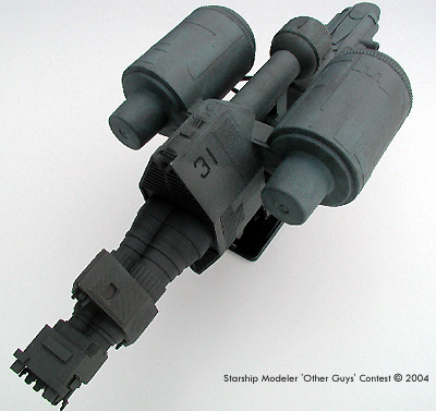 Scale: Not stated In very large fleet operations, there are the tankers that hang back out of the action and there are these guys that run fuel and other supplies up to the front lines. Fittingly, this vessel has various docking ports and options for refueling other ships. It can also push or tug disabled ships around if they get in the fleet's way. I built this ship with film canisters, plastruct parts, pieces scavenged from Snowspeeder and AT-AT models, and of course, many little pieces from my old models' graveyard. Image: Top view Image: Right/rear Image: Port side |