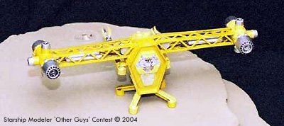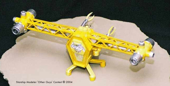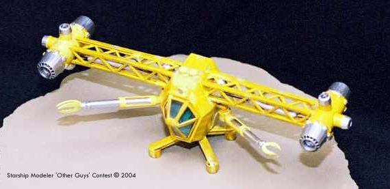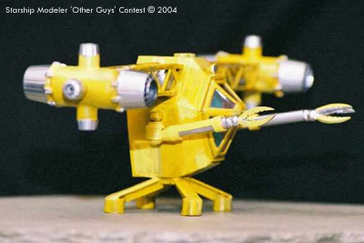 Construction After seeing William Blackmore's excellent kitbash of a Maintenance Fury , I decided to tackle building one too. Armed with some excellent high quality images gleaned from several internet sites, I began by hacking off the reactor detail section from a spares box Monogram Starfury kit. The maneuver thruster nozzles mounted on the engine pod and all four forward engine nozzles were also used in this model, as was the cockpit tub and the window canopy. I used sheet styrene to make the hexagonal box that forms the body of the ship, and then mounted the cockpit tub onto that. I then used epoxy putty to build up the sloping sides that make a smooth transition from the leading edge of the cockpit tub to the leading edge of the body of the ship. I had noticed that the wing-like girders that support the engines have a noticeable anhedral (downward angle). Since I used Plastuct girders for this part, it was easy, if time consuming, to trim a piece from the bottom of the two main girders, bend them down, and then glue them to the angle shown. Smaller Plastuct girders cover the top and bottom of the wings. Once these were built, they form hollow boxes which hold, one presumes, the fuel tanks and pumps. The pumps were made from large plastic cylinders, and the fuel tanks from plastic sprue. The lines that connect these parts to the main hull and then to the engines is stiff brass wire, colored black with a Sharpie pen. The engine bodies were made from PVC pipe that fitted neatly into the Starfury exhaust nozzles; the maneuvering thrusters were perched on top styrene tube sections which had been contour sanded on their bottoms to match the curve of the PVC. Small tube sections were added to make the topside detail of the ship's body, while flat pieces of sheet styrene were added to create the lower side body panels. The hacked off the reactor detail section from the Starfury kit was added to the rear of the body, and the legs were made from salvaged plastic coat hanger which already had a nice "T" cross section. The feet themselves were made from more styrene tube, and filled then with gel CA glue and micro balloons. The manipulator arms were made from yet more styrene tube, and these telescoping tubes were attached to the hull by means of an electrical wire connector. A goal of mine was to make these positional, so that the arm could be posed extended or retracted, elevated or lowered, and swung in an arc from under the wings to straight out in front. The claws were carefully trimmed from a solid slug of resin from a prior project, and minor serrations were added. My personal experience using remote manipulators dictated that the three claw design be used -- the two claws used in the show and in fan art look nice, but would be far less effective. The painting consisted of primer, and some of the nastiest yellows that I could find. Silver was used to cover the various exhaust nozzles, parts of the manipulators, and the parts that were to be contained within the wing. A dark gray watercolor art pen was used to add weathering here there and everywhere but my flash wiped most of that off the finished pictures. The spotlight above the cockpit was ground from a clear plastic push pin, and given a dab of silver paint, and the model was done! Image: Left/rear view Image: Right/rear Image: Arms extended Image: Right side |