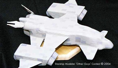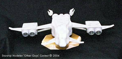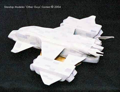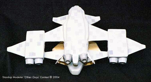 I cut up blocks of foam, and then whittled and carved and sanded them into the different hull shapes. More foam was cut for the outboard wing engine pods, and then thick sheet styrene was used to make the various small wings that are everywhere on this vessel. After a number of futile attempts at making nozzles for the engine pods, I finally made one decent master and sent it off to Ravenstar Studios for molding and casting, and he did a great job on those. The main aft engine nozzles of a Monogram Starfury were used as, well, main aft engines, and the flap-like tines were also taken from the kit. Two sections of pvc tubing were set in the upper aft part of the foam as the bodies of those rear engines; thankfully the pod mounted nozzles only have their exhausts showing. I covered the foam over the entire ship with a thick layer of epoxy putty, giving it a very hard shell. That was the very first time I had tried that, and while it worked, I have found a better way to do this involving talcum powder, set height spacers, a flat surface and a rolling pin. Painting was done in a deliberately haphazard fashion, making for a welcome change. I experimented with using an old laundry mesh bag to create a mottled skin effect. While nice and understated, it was drowned almost completely out by my flash. I have got to improve my picture taking soon! Image: Top/rear view Image: Left/front Image: Right/rear |