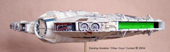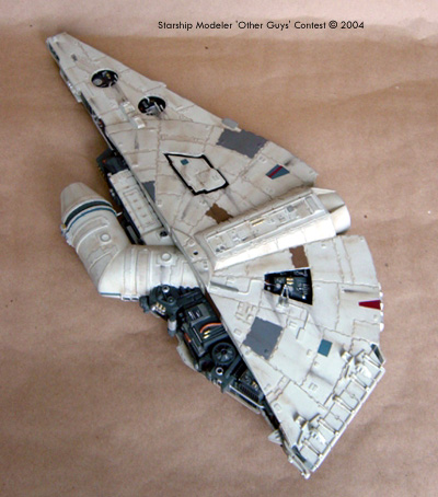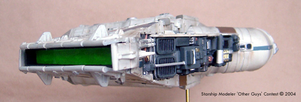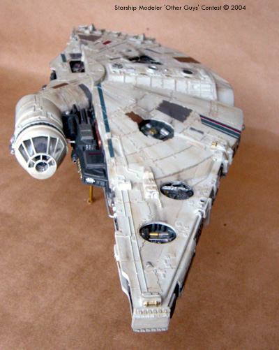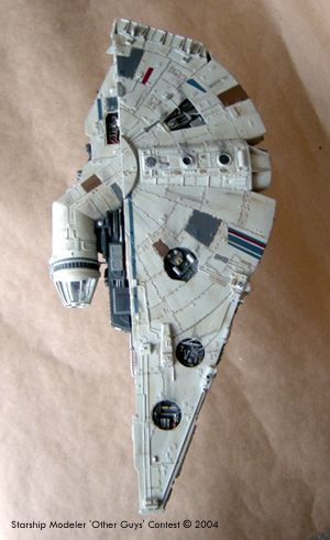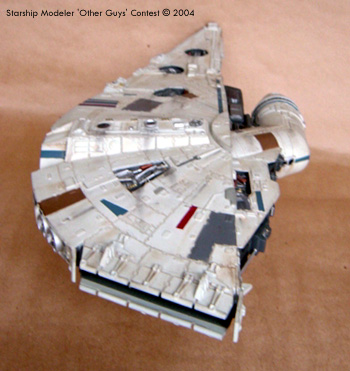 Due to the rapid paced nature of a courier's life, the YT-1350 was not designed with any permanent landing gear. Rather, it uses a highly tuned repulsorlift system. The model was inspired by a 3DO I discovered while searching the web. After getting a built but unpainted model off e-bay I set about cutting. The original sidewalls were discarded, and new one built from scratch to the shorter sidewall height. Both the upper and lower aft sections were removed and built and armor plated using sheet styrene. Great care went into making sure all of the panels matched, and that everything flowed together. The maneuvering veins along the engine were all hand made. The opening left on the starboard side of the main hull was covered with styrene and detailed with custom plates. The cockpit and tube were salvaged from the original kit, while the rest of the outrigger portion was fashioned using pieces from my parts box. The interior of the cockpit was created using the cockpit of a 1/72 Apache helicopter, giving it a one-seat-behind-the-other configuration. The ship was then painted camouflage gray and detailed with various acrylics. Image: Underneath Image: Left/rear view Image: Starboard side Image: Right/rear Image: Top view Image: Top/rear |
