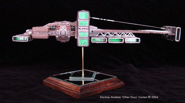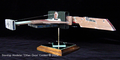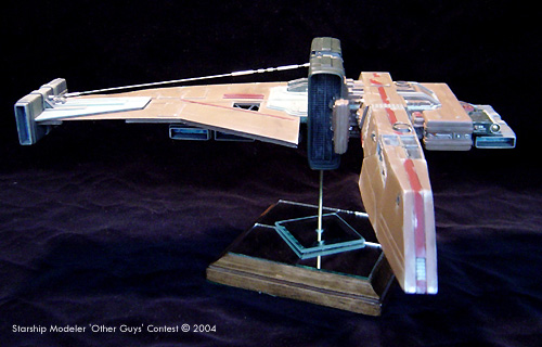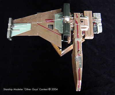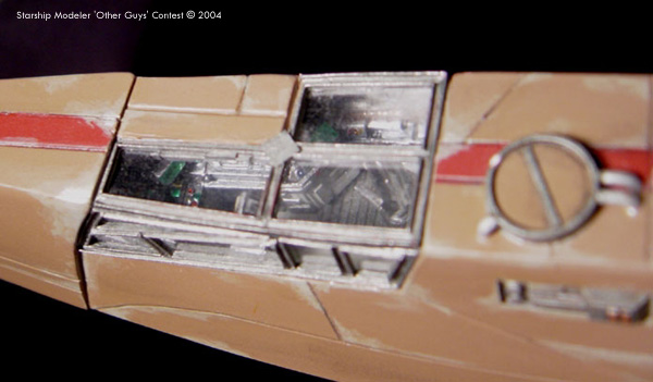 The cockpit is highly detailed with control panels covering almost every surface. There are two distinct areas of the cockpit, the pilot’s area and the navigator’s area. Each of the seats and consoles was built from styrene and greeblies. Other than that, I wanted to go for a kind of piece-meal look to the ship. I designed the primary thrust engine to overcompensate for the size of the craft. The center section of this was left open to expose the “guts” of the engine. The five secondary thrust/maneuvering engines were built to have a different feel that the rest of the model. The entire ship was constructed from scratch using sheet and tube styrene and a small bit of greeblies. The laser cannon was made from brass tube and styrene. It was painted with Tamiya paints. |