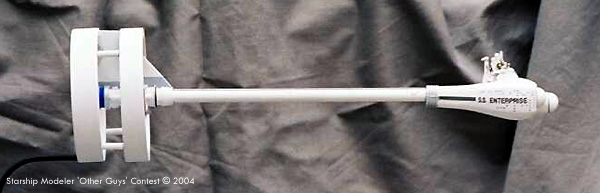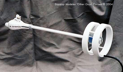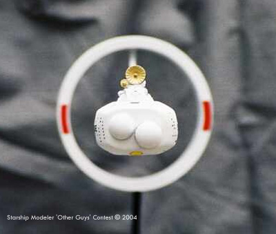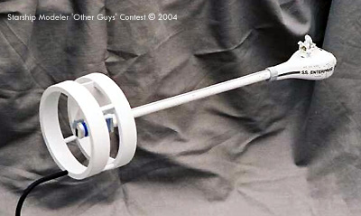 by Joe Brown (as seen in Star Trek: The Motion Picture) Scale: 1/1000The passenger starliner SS Enterprise was in operation throughout the 22nd century and early into the 23rd century. It featured a ring-configured warp drive and passenger accommodations for 129 people, with a crew of 50. The ship was capable of warp 4.8 travel, it and routinely made trips to the Terran, Vulcan, and Andorian colonies, with two trips a year to the vacation world of Risa. Construction Building this ship in scale with the Polar Lights Enterprise was a project that I had planned for some time, and the Other Guys Contest gave me the excuse I needed to get it completed. The design is one of the early Matt Jefferies sketches for the original series Enterprise that was never used. In the film Star Trek: The Motion Picture, it is featured in the wall paintings in the Recreation Room as part of the linage of vessels that had been named Enterprise, or so we hear Decker telling Illya. Scarce and few decent illustrations of this ship are available, so I could use my chosen interpretation of the design without fearing the wrath of the dedicated Trek nay-sayers. I started with a piece of five-inch PVC conduit and sliced off two hoops to make the rings. An old, badly made Stargate Deathglider toy contributed a missile launcher, which became the engine section that holds the aft end of the long boom. |