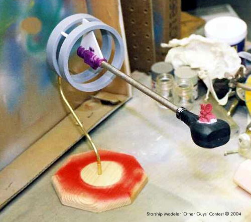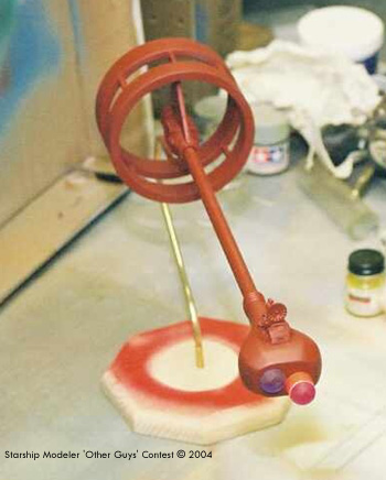 I made the boom from a section of brass curtain rod, and the forward pod that holds the crew and passengers came from two refrigerator magnets shaped like liquor bottles that I glued back to back. The communications tower array came from an Action Fleet Republic Cruiser, and the two protuberances on the bow were from acrylic plastic “findings” that my mom gave me years ago. I glued all of these together with CA glue. The pod, engine, and boom assembly were attached to the hoops with a slab of styrene plastic sheet. I drilled holes in the hoops for spacers that I made from finishing nails, and then I slid simple styrene tubes over those. A brass tube stand was bent into shape with a tubing bender, and a hole was drilled for that at the bottom of the aft hoop. Painting the tube and stand black keeps attention focused on the ship. I primed the ship and painted it off-white. Gold paint was used on the various dishes and antennas, and the windows were painted with a finepoint Sharpie, which were aligned by using a scrap of window screen material. I used blue paint on the grilles in the engine body section, and I used Krylon acrylic silver to add a metallic look to the other engine parts. Apple Barrel Concrete Gray was used to accent various areas and to paint the thin strip of styrene that runs along the top of the boom. I whined and complained about getting the 'SS Enterprise' markings for the ship to look right until my friend Gordon from work suggested using the markings from a Polar Lights Enterprise kit (well, duh). The finishing touch was to add two thin pieces of red styrene to the leading edge of the engine hoop as the Bussard collectors. I coated the ship with two passes of dull coat, and it was done. This was a very fast, pleasant scratchbuild job that I completed in just less than a week; and it's an obscure, sufficiently oddball-looking ship that it really grabs people's attention. Image: Starboard side Image: Bow Image: Parts Image: Primed |