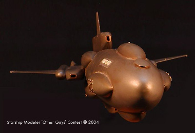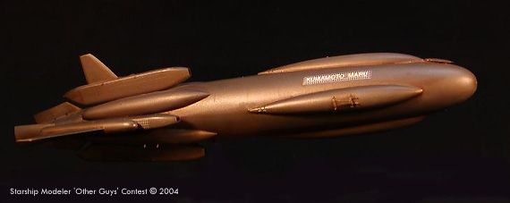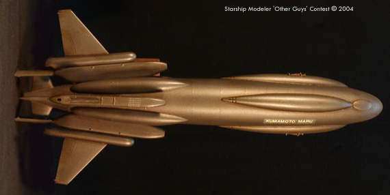 by Clyde Jones Scale: 1/2500This is Star Freighter Kumamoto Maru, heavy bulk transport of 2250 AD. Is equipped with supra-light engines, in redundant quad array for safety. Also has 2 plasma cannon for protection from small raider vessels. Capable of planetary landing for to discharge and pick up cargo, the Maru class freighter is in service with many nations and worlds, and should continue in service for many years to come, much like DC-3 of Old Earth fame. Is constructed from hull of Aurora SKIPJACK submarine, top of hull to bottom. Drive units are from 1/32nd Scale EA-6B, ECM pods. Fairings on hull are from drop tanks, pressed into surface to conform. Sections of silver decal film, masked with common window screen and sprayed with dark gray are used for hull detail. Winglets are from various jet aircraft. Paint is Pollyscale “Graphite”. Maru is named for friendly local modeler and dentist (in spite of which, is really nice guy). Image: Front view Image: Top view |