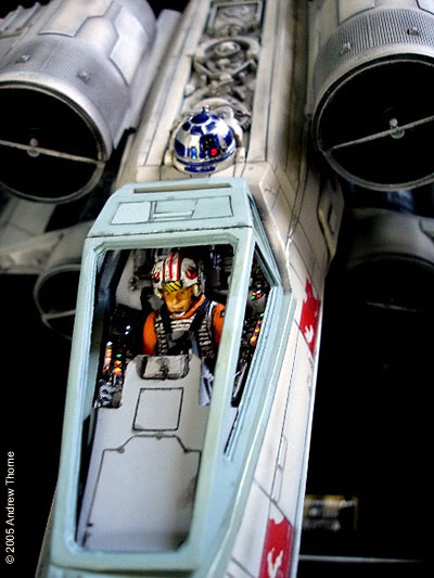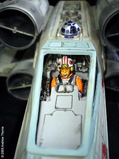 This is my Studio scale X-Wing. It was my first studio scale model. The kit came from Mike Salzo, and what a kit it is. This is one kit that I'm glad I was fortunate enough to get. The kit itself is resin and required hardly any clean up. I thought while I was building it I may as well light it. For this I chose the Hyperdyne labs Light kit which consists of a small circuit board and 16 LEDs. The engines have a red glowing lED and an orange flicker LED. R2 lights up via fibre optics, as does the cockpit. Painting was done by first giving it a coat of white, then pre-shading with black. Next it was sprayed humrol grey. After that was left to dry overnight, I applied a wash of black enamel, then, once that had dried I gave it a rub down with very fine steel wool. The overall effect is incredible. Image: Another view Image: The cockpit Image: The pilot |
